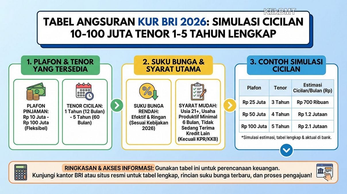 Jangan ajukan KUR BRI 2026 sebelum cek tabel angsuran ini! Simulasi cicilan 10-100 juta tenor 1-5 tahun tersedia lengkap. Baca selengkapnya!